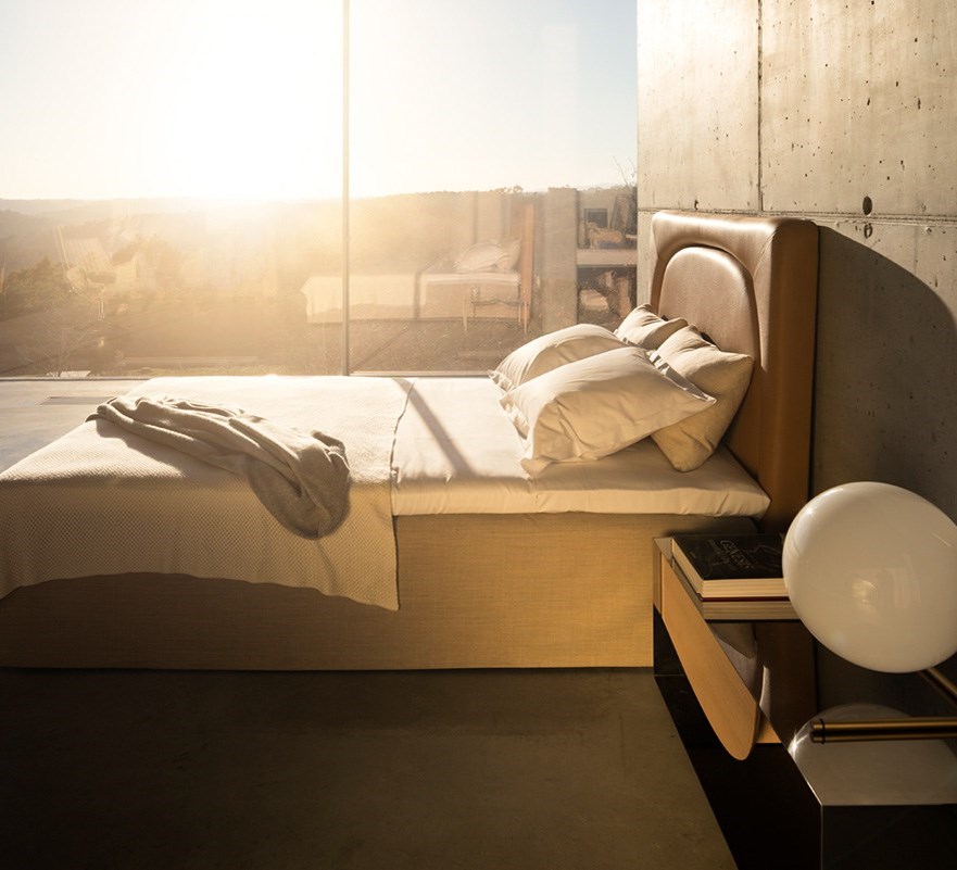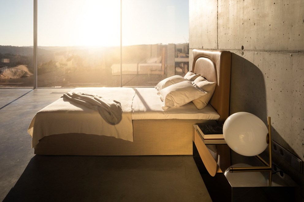 De Eden is een zacht, gestoffeerd hoofdbord voor DUX-bedden met een eenvoudige, maar verfijnde uitstraling in de vorm van een boog.