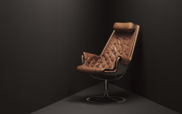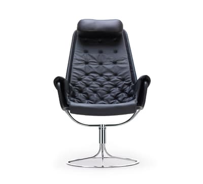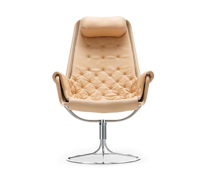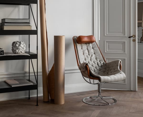 Iconische fauteuil ontworpen door Bruno Mathsson. De Jetson-stoel weerspiegelt zowel zijn obsessie met comfort als een klassieke Zweedse moderne designbenadering. De fauteuil heeft een komvormige zitting en een ergonomisch ontworpen hoge rug met hoofdkussen. Verchroomde draaivoet met uniek terugkeermechanisme.