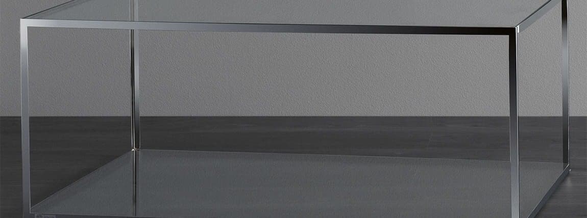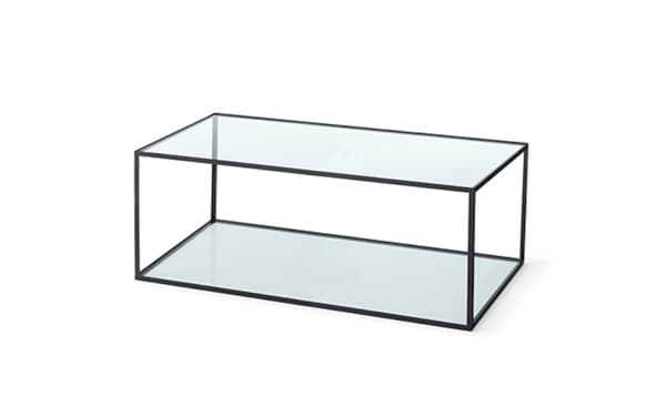 Een klassieke tafel met een rechthoekige vorm van chroom of zwart metaal, en met een glazen boven- en onderkant.