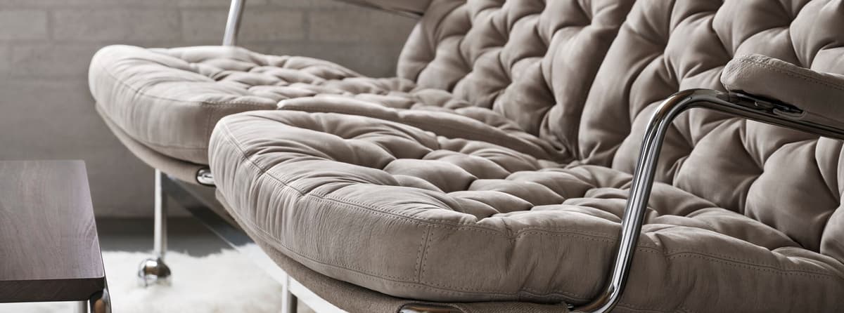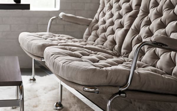 De Karin 73 is een elegante 2-zitsbank op basis van een klassiek design, met een fijn verchroomd frame en diep gestikte kussens.