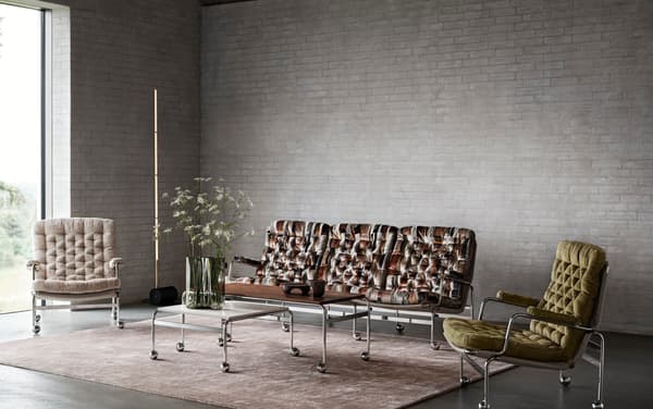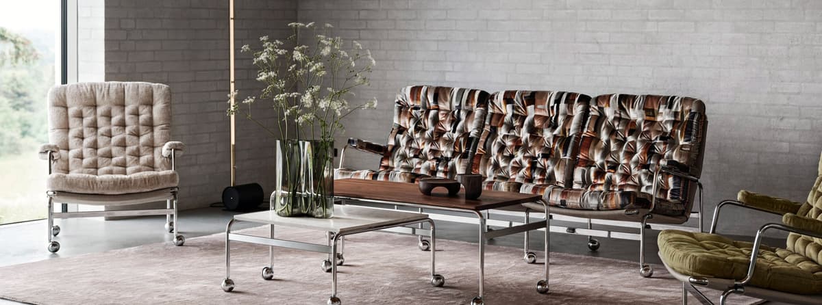 De Karin 73 is vernoemd naar het jaar van haar debuut. Het design is gebaseerd op de originele Karin-leunstoel, ontworpen door Bruno Mathsson. Nu gaan we nog een stapje verder met deze collectie en bieden een 3-zitsbank met hetzelfde klassieke, elegante design. Geniet van luxe comfort met gevulde kussens die op een verchroomd frame met dragende, geweven stof rusten. Naast zitbanken en de originele stoel heeft de Karin 73-lijn ook een voetenbank en tafels die verkrijgbaar zijn in verschillende maten.